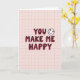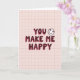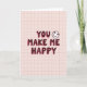 This card features the big phrase “YOU MAKE ME HAPPY” centered and filling most of the front, with rounded deep maroon letters that feel cozy and affectionate ❤️. Each letter has a slightly offset bubblegum-pink shadow that adds depth and a gentle sense of movement, like the words are leaning in for a hug. In “YOU,” the “O” is replaced by a heart-eyes face, with a simple white circle, a thin black outline, and bright red hearts for eyes that give the line a flirty, friendly spark 🥰. The layout stays tidy and easy to read, letting the message do the talking without extra characters crowding the scene. The text color contrast—maroon against pink, plus the pink shadow—creates a soft romantic push-and-pull that feels like a sweet exchange between two people. Behind everything is a blush pink background with a faint grid pattern, like a neatly ruled journal page. The overall look is evenly lit and smooth, with the maroon lettering, pink drop shadow, and heart-eyes face floating over the pale grid.
