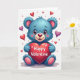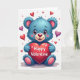 This greeting card shows a chubby blue teddy bear sitting upright and holding a big red heart close to its belly. The bear has pink inner ears and pink paw pads, with wide shiny eyes, rosy cheeks, and a friendly smile that feels full of love ❤️. Around the bear, small heart balloons in red and purple float in the air, with a few tiny star shapes sprinkled between them. The background is plain white, which keeps all the focus on the bear and the heart it’s offering. On the red heart, the words “Happy Valentine” appear in white flowing cursive letters across the front. The heart takes up much of the lower center of the card, making the message easy to spot right away 💘. It’s a sweet, simple scene that fits romance, friendship, or a kind note to someone you care about 😘.