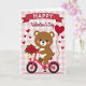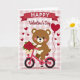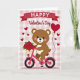 Designed with a cute brown bear sitting on a small pink bike, this card feels sweet and romantic 💘. The bear has rosy cheeks and a gentle smile, and it looks like it’s enjoying the ride. A basket on the handlebars is filled with deep red roses, with lots of petals packed together. The background is a light pink and white gingham pattern with little red hearts scattered around. Off to the side, there’s a big heart-shaped balloon floating near the bear, with a thin string hanging down ❤️. At the top, a red ribbon banner says “HAPPY Valentine’s Day” in white letters, with “HAPPY” in all caps and “Valentine’s Day” in a flowing cursive style. The mix of pinks, reds, and warm brown tones keeps the whole scene cozy and loving 😘.
