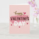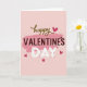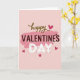 This greeting card features the message “Happy Valentine’s Day” centered on a soft blush pink background. The word “happy” sits near the top in shiny gold lettering with a flowing, cursive look. Under it, “VALENTINE’S” appears in deep maroon, all caps, with a slight shadow that helps it stand out. A wide stripe of rosy pink brushstroke texture runs behind that middle word, adding a cozy, painted feel. At the bottom, “DAY” is set in thick white letters with tiny pink speckles and a faint outline. Small glossy magenta hearts are scattered around the text, like little notes of love floating nearby 🥰. It feels meaningful to give because the colors and hearts keep things warm and simple, making it easy to say you care ❤️.