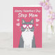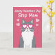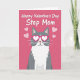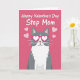 This Valentine's Day card features a bright fuchsia pink background that immediately feels loving and fun ❤️. In the center, there’s a stylized gray cat with a white chest, a small smile, and thin white whiskers that spread out on both sides. The cat wears pink heart-shaped sunglasses, giving it a sweet, confident look. Around its head, a few soft, see-through pink hearts float in the background, adding to the romantic feel. Near the top of the card, the text reads “Happy Valentine’s Day Step Mom” in smooth, rounded white lettering that stands out clearly against the pink. The simple layout keeps your attention on the cat and the message, making it easy to understand at a glance. It feels meaningful to give because it combines a cute character with a direct note of appreciation that can fit both affection and close friendship 🥰.