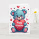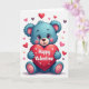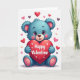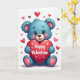 This card shows a fluffy blue teddy bear sitting front and center on a plain white background. The bear has wide eyes, a small sweet smile, and pink cheeks that make it look a little shy and loving 💘. It’s holding a big red heart close to its chest, like it’s offering it to someone special. On the heart, the words “Happy Valentine” appear in neat white letters, easy to read and placed right in the middle. Small star shapes in white sit near the text and add a light sparkle effect. Around the bear, several small hearts float in red, pink, purple, and peach, filling the space with a cozy romantic feel ❤️. It’s a simple, friendly design that works for a partner, a close friend, or anyone you care about 😘.