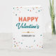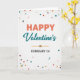 This card features a creamy white background with a light texture and a shower of round confetti dots in red, teal, orange, pink, and purple. At the top, the word “HAPPY” sits in warm coral letters with a simple, thick print style that feels upbeat. Under it, “Valentine’s” appears in teal letters that look like smooth, connected handwriting, giving the design a softer, romantic feel 🥰. A thin ochre line runs beneath, with two overlapping dots—one teal and one orange—like a tiny accent in the middle. Near the bottom, “FEBRUARY 14” is printed in plain black letters, easy to read and centered. The mix of colors and the floating confetti make it feel like a small celebration without being too loud. It’s a meaningful card to give because it says the day clearly while also feeling warm, friendly, and full of affection ❤️.