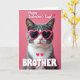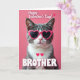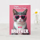 This Valentine's Day card shows a tabby-and-white cat centered on a bright fuchsia-pink background. The cat wears oversized pink heart-shaped sunglasses with dark lenses, giving it a cool, slightly mischievous look. You can see the tabby stripes clearly, along with a white muzzle, a pink nose, and whiskers spreading out to the sides. At the top, the words “Happy Valentine’s Day!” appear in white, flowing cursive-style letters, with a small red heart nearby. Near the bottom, “BROTHER” is written in thick, rounded white letters, with a red heart on each side. The simple layout makes the message easy to read and puts the focus on love and connection, especially between siblings. It feels meaningful because it’s funny and affectionate at the same time, so it can say “I care about you” without being too serious 🥰❤️. Hope it helps you share Valentine’s Day sentiments with someone you love.