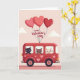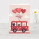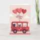 This greeting card shows a cherry-red bus with rounded corners, driving across a light pink background with small white clouds. Three cats look out from its big windows: one black, one brown tabby, and one creamy white, all with wide eyes and tiny rosy cheeks. Their faces look happy and friendly, like they’re off on a sweet Valentine’s trip. Above the bus, three heart-shaped balloons float up in shades of deep red and soft pink, tied on thin strings. Near the top of the card, the words “Happy Valentine’s Day” appear in red cursive-style lettering. The simple pink and red colors keep the scene warm and romantic without feeling too busy. It’s an easy way to say “I’m thinking of you” to a partner, friend, or family member 💘❤️.