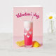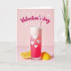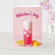 This greeting card features a tall clear glass filled with a soft pink drink, topped with a light layer of white foam. Three small white hearts sit on the front of the glass, adding a sweet touch, while a pale pink straw leans out from the top as if ready for a sip. The background is a gentle blush pink that keeps the focus on the drink. At the base of the glass, two bright yellow lemon pieces—one wedge and one rounded half—add a fresh pop of color. Near the top, the words “Valentine’s day” appear in flowing pink lettering, surrounded by tiny white sparkles. The scene feels warm and inviting, perfect for sharing love or friendship on Valentine’s Day 💕❤️