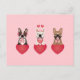 Illustration of three French Bulldog puppies of different colors popping out of hearts dressed in Valentine's Day attire.