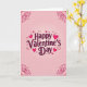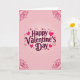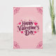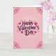 This greeting card centers on the words “Happy Valentine’s Day” in deep reddish-purple cursive lettering, placed right in the middle of the front. Around the message, you’ll see lots of hearts—some filled in glossy magenta with tiny light reflections, and others shown as simple heart outlines. The background fades from a very light pink near the center to deeper pink toward the edges, giving it a soft glow. If you look closely, there’s also a faint pattern of small pale-pink hearts across the whole background. Each corner has darker crimson curling line details that frame the design, and a darker pink border runs all the way around the edge. It feels like a sweet, thoughtful way to say you care, whether it’s for a partner or a close friend 🥰❤️.