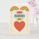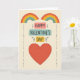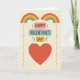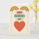 This greeting card features a simple digital illustration that centers on the words “HAPPY VALENTINE’S DAY!” across the top and middle. The text is in an easy-to-read sans‑serif style, and it sits on three uneven color panels in pastel pink, cool teal, and sunny yellow. Below the message, a large deep red heart rests near the bottom, outlined with little dashed stitch marks that make it feel like a sewn patch. Two small rainbows arch above the words, with bands of red, golden yellow, and teal, and each one has dotted lines hanging down like gentle rain. The background is a creamy beige, which keeps everything soft and calm. Small accent lines near “HAPPY” and “DAY!” add a bit of celebration without taking over. It feels meaningful to give because it’s bright, friendly, and clearly says what you want to say, whether it’s for a partner or a close friend 🥰❤️.