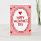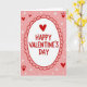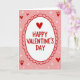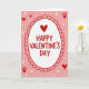 This sweet card features a classic Valentine’s greeting in soft pink, bright red, and clean white. In the center, a slightly uneven oval is framed by a pretty scalloped red border. Inside, the words “HAPPY VALENTINE’S DAY” appear in a friendly red font, topped with a small red heart for a special touch.