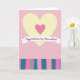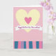 This greeting card features a large pale yellow heart near the top, with a smaller fuchsia-pink heart tucked inside it, like a simple hug in picture form 🥰. The background is light pink with subtle horizontal lines that give it a gentle textured look. Across the middle, a white ribbon banner stretches from side to side. On the banner, the words “Happy Valentine’s Day Mom and Dad” appear in smooth, flowing white lettering that looks like neat cursive and sits centered on the ribbon. Below the banner, the bottom section is filled with vertical stripes in deep teal, fuchsia, soft lavender, and light pink. The mix of soft hearts above and strong stripes below makes the design feel loving but not too sugary. It’s a meaningful card to give because it clearly shows care and appreciation for both parents in one warm message ❤️.