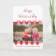 A folded greeting card with two rows of red and pink hearts. The design shows the words " Happy Valentine's Day" and a template photo. The photo is meant to be swapped out for your own.