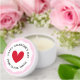 Soy candles featuring a red heart surrounded by custom text "Happy Valentine's day" and your name with a light pink, wavy border.