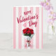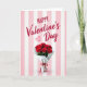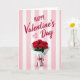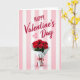 This greeting card shows a full bouquet of deep red roses centered on the front, with soft, velvety petals that feel classic and romantic. The stems are wrapped in bright white paper that gathers neatly at the bottom, tied with a slim red satin ribbon. Above the flowers, the words “HAPPY Valentine’s Day” appear in dark red, flowing cursive-style letters, with a small heart drawn nearby. The background is made of vertical stripes in blush pink and white, giving the scene a gentle, cozy setting. The roses look fresh and full, like they were just picked for someone special. It feels meaningful to give because it says “I care about you” in a simple, familiar way, whether it’s for a partner or a close friend 🥰. The message is easy to spot at the top, and the bouquet below does most of the talking ❤️. Hope it helps you share Valentine’s Day sentiments with someone you love.
