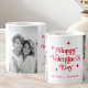 Coffee mug featuring the text "Happy Valentine's day" in red surrounded by retro stars and the couple's names below. On the sides are two photo templates.