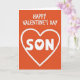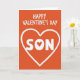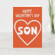 This card features a tangerine-orange background that feels warm and cheerful right away. Across the top, the text “HAPPY VALENTINE’S DAY” appears in white, with a slightly uneven handwritten look that makes it feel sincere. In the center, the word “SON” is written large in white and sits inside a simple white heart outline with small, imperfect lines. A sweet detail is that the “O” in “SON” is replaced by a small white heart, which adds an extra note of love. The strong contrast between the white lettering and the orange background makes everything easy to read at a glance. It’s a simple design, but it clearly says “you matter to me,” which can mean a lot between parent and child 🥰. Giving this card is a gentle way to show affection and closeness without needing a long message ❤️. Hope it helps you share your Valentine’s Day