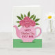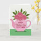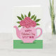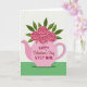 This Valentine's Day card shows a pink teapot in the center, used like a vase, with five soft pink roses coming out of the top. Each rose has layered petals and a deeper pink, heart-shaped center that feels sweet and romantic 🥰. Emerald-green leaves fill out the bouquet and stand out nicely against the lighter flowers. Behind it all is an off-white background with light diagonal stripes, and a solid green band along the bottom that grounds the picture. On the front of the teapot, the text reads “HAPPY Valentine’s Day STEP MOM” in red, with “Valentine’s Day” in a flowing cursive style and the other words in simple print. The teapot has a gentle shadow underneath, giving the picture a little depth without making it feel busy. It’s a meaningful card to give because it mixes a warm message with a cozy, homey image that says “you’re appreciated” ❤️. Hope it helps you share your Valentine’s Day sentiments.