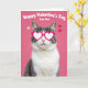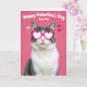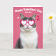 This card shows a tabby-and-white cat facing you straight on against a bright magenta background. The cat’s face looks calmly serious, which makes it even funnier and cuter. It’s wearing oversized fuchsia, heart-shaped sunglasses with white lenses right across its eyes, making the glasses the main focus. Near the top, the text reads “Happy Valentine’s Day Step Mom” in rounded, white letters that curve slightly across the space. Small pink hearts sit up in the corners, adding a simple romantic touch. Soft lighting brings out the fluffy white fur and long whiskers, so the cat feels close and real. It’s a sweet way to say “I’m thinking of you” with a bit of humor, especially for a step mom you care about 🥰❤️.