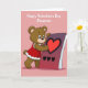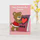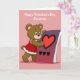 This Valentine's Day card shows a cute teddy bear standing against a soft pink background, looking right at you with a sweet, hopeful expression 🥰. She’s wearing a red dress with white scalloped trim and holding a large burgundy card in both paws. On that card is a big shiny red heart, framed by a darker frilly edge, with three small black hearts lined up underneath. Above the bear, the words “Happy Valentine’s Day Stepmom” appear in white bubble-style letters near the top of the card. The simple glow and gentle shading make the bear and the card feel warm and close, like a small moment of care. It feels meaningful because it’s clearly meant for a stepmom, and the bear’s careful pose makes the message feel sincere ❤️. Share it to help someone feel seen and appreciated on Valentine’s Day.