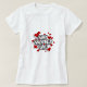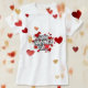 A plain white T-shirt featuring a vibrant graphic design. The design showcases the phrase "Happy Valentine's Day!! in bold, playful lettering, surrounded by scattered red hearts. The overall look is cheerful and festive, perfect for her!