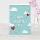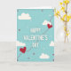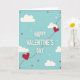 This greeting card features a calm aqua background that feels like an open sky, with white cloud shapes floating around. In the center, the text “HAPPY VALENTINE’S DAY” is set in white rounded sans-serif letters with a light shadow that helps it stand out. Small white hearts are scattered across the scene like tiny notes of love. Two larger red hearts sit on opposite corners, drawing your eye across the card. A dashed maroon line curves between them, suggesting a sweet connection from one heart to the other. A matching dashed border runs around the edge to frame everything neatly. The overall look is simple, bright, and full of affection 💘❤️.