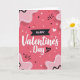 This greeting card features a cerise pink background that feels bright and happy for Valentine’s Day. The main text reads “Happy Valentine’s Day” across the center, with “HAPPY” in white letters inside a black banner near the top of the message. “Valentine’s Day” is written larger in white, in smooth flowing lettering, and it has a light shadow that helps it stand out. Around the words, there are scattered dots in white, black, and blush pink that look like confetti drifting across the page. Soft pastel pink shapes with rounded edges move through the background, some traced with thin white or black outlines. A hollow black heart sits under the word “Day,” and a solid white heart rests in the upper right, adding a simple romantic touch ❤️. Little black dash marks around the design feel like tiny sparks of celebration, making it a sweet card to give when you want someone to feel noticed and cared for 🥰.