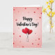 This greeting card features the words “Happy Valentine’s Day!” in black, flowing lettering placed near the top center of the front. Below the message, two shiny deep-red heart balloons sit side by side, with a light gleam that makes them look gently inflated. Their thin black strings twist together as they hang down, giving a sweet feeling of connection. The background fades from very pale pink at the top to a slightly deeper rosy pink near the bottom, like a soft glow behind everything. Scattered around are small red hearts, white outline hearts, and white outline stars that look like they’re drifting in the air. The whole scene feels simple, romantic, and easy to give to someone you care about, whether it’s a partner or a close friend 🥰❤️. It’s a thoughtful way to share Valentine’s Day sentiments.
