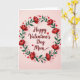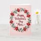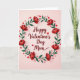 This Valentine's Day card shows the words “Happy Valentine’s Day Mom” in deep crimson, written in flowing cursive across the center. A round wreath of rich green leaves surrounds the message, dotted with layered red flowers that have tiny white centers. The background is a soft blush pink, which makes the reds and greens stand out without feeling loud. Small red hearts are scattered around the wreath, and they look like they’re gently floating near the text. Light shading gives the flowers, leaves, and hearts a bit of depth, so the design feels warm and thoughtful. It comes across as a simple, sincere way to tell your mom you love her and appreciate her 🥰. The mix of flowers and hearts keeps it sweet and romantic while still feeling caring and family-focused ❤️.