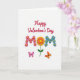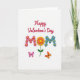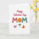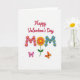 This Valentine's Day card shows a white background with flowers arranged to spell out “MOM” in the center. The first “M” is made from fuchsia-pink daisies with bright yellow centers, and the second “M” is made from soft sky-blue daisies. The “O” is a large sunflower with golden petals and a warm orange-pink center, and a green stem with leaves drops down from it. Above the flowers, the words “Happy Valentine’s Day” appear in red cursive-style lettering near the top of the card. Two butterflies hover nearby—one rose-pink on the left and one tangerine on the right—adding a gentle sense of motion. The overall look feels sweet and caring, like a small thank-you for everything a mom does 🥰. It’s a simple way to share love and appreciation on Valentine’s Day ❤️, and a friendly way to share Valentine's Day sentiments.