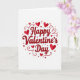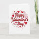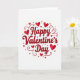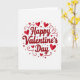 This Valentine's Day card features the words “Happy Valentine’s Day” in deep red lettering placed right in the center. The text has flowing, connected strokes with gentle curves, and it sits inside a loose oval shape made by the layout. Around the message, you’ll see many hearts in the same deep red, in different sizes and styles. Some hearts look flat and solid, while others look folded like paper with small shadows that make them seem raised. Curving red lines wind between the hearts and frame the greeting, adding extra movement without taking over the design. The background is plain white, which makes the red details stand out clearly and keeps the focus on love and affection. Overall, it feels sweet, romantic, and easy to share with someone special