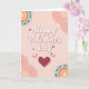 This greeting card shows a soft pink background with lighter, cloud-like shapes framing the top and bottom edges. Near the top center, the words “Happy Valentine’s Day” appear in white, flowing cursive-style letters with a faint shadow that helps them stand out. Beneath the message sits a deep red heart, with short lines radiating around it like a little pulse of love. In the corners, there are round floral designs that look like patterned candies, made with rings of yellow, orange, and coral, edged with teal scallops and tiny pink hearts. Small red and white hearts are scattered across the card like confetti, adding extra warmth without crowding the scene. It feels meaningful to give because it keeps the focus on simple affection and a clear, kind message ❤️.