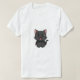 An adorable cartoon illustration of a chubby black kitten dressed in a spooky costume. The character is sitting and wearing a black vampire cape with red lining, featuring large, glittering golden eyes and a wide, cheerful smile that reveals tiny fangs.