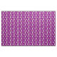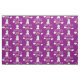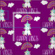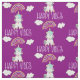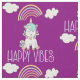 Patterned fabric with a cute illustration of a white unicorn sitting on its rump smiling and looking happy. Smiling clouds and a rainbow overhead. Text says: Happy Vibes. Adorable uplifting image. With a pinkish purple background.
