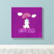 A canvas print with an adorable drawing of an awesome unicorn sitting on its butt peaceful and happy. Cute fluffy clouds and a colorful rainbow above. Text says: Happy Vibes. Awesome positivity. Set on a pinkish purple watercolor background.
