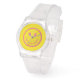 I only have one complaint. I ordered the watch with clear case and strap, and what was sent was white case and strap. I'm going to keep it because 1) it looks very nice in white, and 2) it would take too long to get a replacement made and sent in time for my occasion. Aside from the mix up with the color, the watch does look very good in white. The purple dial is actually sparkly which did not show in the online images. That was a nice surprise. If you like Swatch watches this is very similar to those. It's 33.6mm in diameter, 10.5mm thick, and 40.6mm lug to lug. Stainless steel case back says 3ATM/30m WR, so no swimming or showering or submerging this one. If you like Woodstock, this is a great choice.