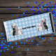 These wrappers for full size Hershey Chocolate bar favors are blue and white plaid with a happy mother white cat sitting with her three cute kittens who are black, white, and grey all wearing pink bows. Customise your text with the template.
