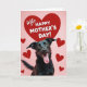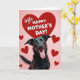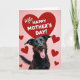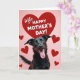 This card shows a dark-coated dog centered on a soft pastel pink background, looking straight out with warm amber eyes and an open-mouthed grin. Its bright pink tongue and neat white teeth add a friendly, affectionate energy, like it’s sharing a sweet moment with someone it loves ❤️. Near the top sits a large red heart that draws the eye first, setting a romantic, caring tone against the gentle pink. Inside the heart, the message “Wife HAPPY MOTHER’S DAY!” appears in white lettering, arranged to fit neatly within the shape. Smaller red hearts are sprinkled around the dog, like little love notes floating in the air 🌼. The contrast between the deep fur color and the soft backdrop keeps the dog’s face as the main focus while the hearts frame it with warmth. The upper heart is the biggest element, with the smaller hearts spaced across the background and the dog’s head and shoulders filling the center. The pastel pink field stays smooth and uncluttered, with red hearts and white text standing out sharply above the dog’s smiling face.
