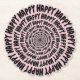 Happy in a fun handwritten font goes around in a spiral of concentric circles on a dusty pink background. A fun tableware design for your next Happy Hour or Happy Birthday celebration.
