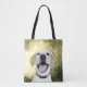 Young yellow labrador retriever with a big goofy smile on his face and a complimentarily colored background dog lovers tote bag