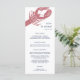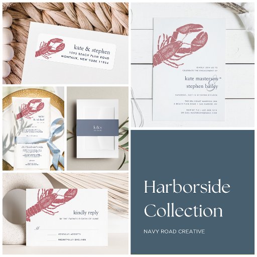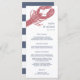 Coastal chic wedding menu in nautical navy, red & white features your starter courses, entrees and desserts in elegant lettering, with your names and wedding date accented by a vintage etched style lobster illustration in muted, faded red. Coordinates with our Harborside collection for nautical, beach or summer weddings and celebrations.