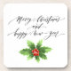 This hard plastic coaster set is shown in a festive Christmas holiday holly print with greetings.