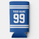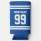 Hard seltzer can coolers with sports jersey number. Athletic stripe design with custom name. Blue or custom color. Cool gifts and party accessories for sports fans, football players, coach etc. Double sided print. Personalize with your text.