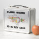 Showcase your wry DNA replication sense of humor with this lunch box featuring the saying "Hard Work Is In My DNA". Make others do a double-take about where you get your hard worker nature from with a dose of genetics attitude at your next meal with this metal lunchbox!