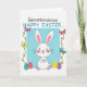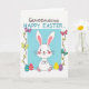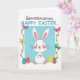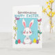 This card features an anthropomorphic hare as the main figure, sitting calmly with paws held together as if offering a gentle hello 🐰. Its fur is white, its tall ears are lined with soft pink, and its cheeks are rosy, giving it a tender, friendly look that feels a bit like a quiet hug between close friends. The hare sits inside a glowing rectangular panel in light sky-blue that helps the character stand out. Around that blue panel, curling brown vines wind along the edges with small green leaves, adding a natural frame. Four butterflies flutter nearby in purple, hot pink, lime green, and teal, bringing a light, airy sense of motion 🌷. Near the bottom, four decorated egg shapes show patterns like stripes, dots, and star motifs in blue, red, yellow, and purple. Above the illustration, two lines of text appear, with the top line in dark charcoal-style lettering and the second line in light blue letters. The final detail is the way the eggs sit along the base beneath the vines, each one slightly different in pattern and color.