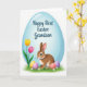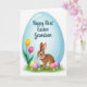 This card features a large sky-blue egg shape filling most of the front, with a soft highlight that makes it look gently glossy. In the middle sits a young bunny-like character with warm brown fur, a lighter belly, and long ears, gazing slightly to the side as if sharing a quiet, friendly moment 🐰. Around the character are several smooth pastel eggs in lavender, pale pink, and sunny yellow, resting in a bright green patch of grass. Small white flowers with yellow centers dot the ground, adding tiny spring details 🌷. On the left side, two tall flowers rise on slim green stems—one yellow and one deep magenta—with petals opened wide as if leaning toward the bunny. Near the upper area of the blue background, a short greeting is placed in a flowing style, written in a darker blue that stands out without looking harsh. The scene is softly lit, and the big blue egg backdrop frames the bunny and pastel eggs against the grassy base with scattered blossoms.