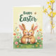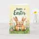 This design shows two long-eared, hare-like creatures in soft light-brown tones cuddling close on fresh green grass, their noses touching as if sharing a quiet secret 🐰. Their cheeks carry a rosy blush, and their fluffy white tails and gentle fur texture make the embrace look tender and unhurried. Around them, a ring of spring wildflowers rises on slender green stems, mixing soft pink, orange, and sunny yellow petals like a garden gathering 🌷. The flowers frame the couple in a way that makes their closeness feel like the center of a little shared world. Near the top, a seasonal greeting sits in deep emerald-green lettering, centered above the scene against the open sky-like space. A small warm-toned butterfly hovers nearby, angled as if it has just drifted past the words. Behind everything, a pale yellow gradient glows softly from the upper area, fading lighter as it reaches the grassy ground.