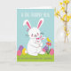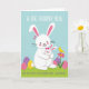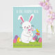 This greeting card features a large white hare with rosy cheeks and a gentle smile, holding a smaller white companion close in a snug hug 🐰. The smaller bunny wears a soft pink bow and rests with eyes closed, leaning in as if trusting a dear friend. Both have inner ears dotted in bright fuchsia, adding a sweet burst of color against their pale fur. A light blue background suggests a spring sky, while a green patch of ground anchors the scene like a grassy meadow. Scattered on the grass are decorated oval eggs in lavender, sunny yellow, and pink, finished with simple stripes and dots 🌷. Short text sits above and below the pair in a friendly rounded style, with lettering in a darker tone that stands out clearly against the pale background. On the right side, a tiny yellow bird balances on a bright pink flower with a small green stem and leaves.