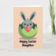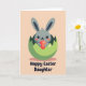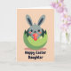 This card shows a sweet, stylized little bunny peeking out of a cracked green eggshell, as if it’s just surprised a close friend with a shy reveal 🐰. Its long gray ears frame a round face with big dark eyes, and the faint rosy cheeks give it an affectionate, almost bashful look. The background is a smooth soft-peach field that keeps the focus on the character and adds a gentle spring warmth 🌷. Nestled in the bunny’s paws is a deep red decorative egg with tiny white dots and a single star, held like a small gift meant for someone special. A muted shadow sits beneath the shell to anchor the scene and add a bit of depth without clutter. Near the bottom, a short celebratory phrase appears in rounded lettering, set in a darker tone that stands out clearly against the peach backdrop. The green shell pieces angle outward around the bunny, with jagged edges and a dusky base shadow.