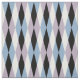 A mid-century inspired design featuring a harlequin diamond pattern in blue, dusty lilac, black and white.