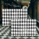"Harlequin Ephemera Black n White Wood Decoupage, heavy weight tissue paper for crafting and furniture decoration." Rustic elegant black and white painted Harlequin diamond pattern that has been distressed and work over a white crackle finish wood background. Script ephemera handwriting overlay finishes the design. Painted in watercolor and graphically designed by internationally licensed artist and designer, Audrey Jeanne Roberts, copyright.